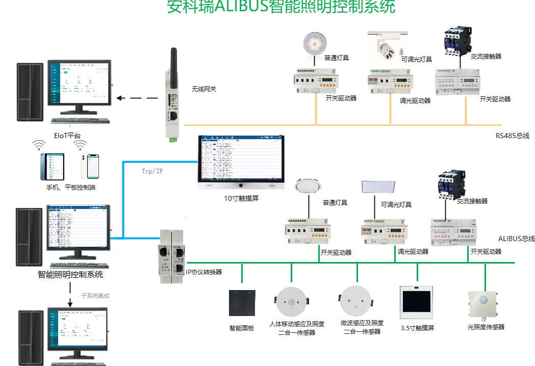 智能照明控制系統(tǒng)是安科瑞新一代自有知識產(chǎn)權(quán)的照明控制解決方案,基于成熟的RS485通訊控制技術(shù)。同時創(chuàng)新地引入了載波偵聽和沖突碰撞檢測機制,多機間的實現(xiàn)了實時雙向通訊。線材使用的超六類屏蔽網(wǎng)線,一次性解決通訊與供電問題。整個系統(tǒng)由輸出設(shè)備、輸入設(shè)備和系統(tǒng)元件。輸出設(shè)備負責接收和處理傳感器傳送的信號,并執(zhí)行相應(yīng)的操作,如開/ 關(guān)燈、調(diào)節(jié)燈的亮度。輸入設(shè)備負責根據(jù)現(xiàn)場手動操作,或探測光線、人體運動等變化,向驅(qū)動器發(fā)出相應(yīng)的控制信號。系統(tǒng)元件主要負責搭建系統(tǒng)平臺,如IP協(xié)議轉(zhuǎn)換器、中繼器等。