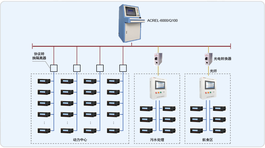 系統(tǒng)采用分層分布式結(jié)構(gòu),站控管理層及現(xiàn)場設(shè)備層,站控管理層設(shè)備為我公司一套琴臺式電氣火災(zāi)監(jiān)控設(shè)備及2套壁掛式電氣火災(zāi)監(jiān)控設(shè)備,對分散在各區(qū)域內(nèi)的ARCM剩余電流式電氣火災(zāi)監(jiān)控裝置進行遙測、遙信,實現(xiàn)監(jiān)控與管理。各區(qū)域內(nèi)探測器采用RS485總線直接接入琴臺式電氣火災(zāi)監(jiān)控設(shè)備。系統(tǒng)采用Acrel-6000電氣火災(zāi)監(jiān)控系統(tǒng),實現(xiàn)對被保護電氣線路的實時監(jiān)測。