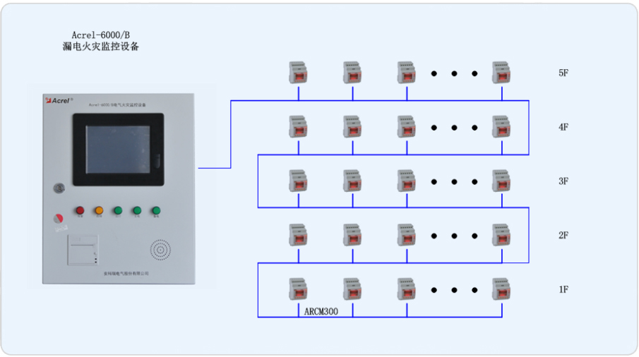 系統(tǒng)組網(wǎng)共分為站控管理層、網(wǎng)絡(luò)通訊層、現(xiàn)場設(shè)備層三層,該項(xiàng)目通訊總線共接入一條通訊總線,總線在樓層配電箱手拉手串接后,接入壁掛式后臺(tái),組成電氣火災(zāi)系統(tǒng)的大動(dòng)脈。箱體中漏電流互感器通過電流線接入漏電探測器,漏電探測器實(shí)時(shí)顯示漏電情況,組成一套信號(hào)穩(wěn)定,精度可靠的電氣火災(zāi)監(jiān)測系統(tǒng)。