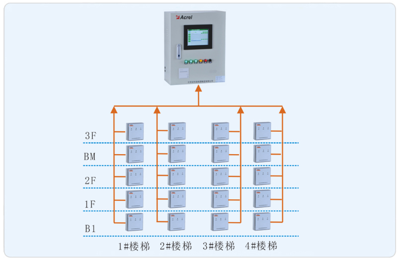 系統(tǒng)采用安科瑞防火門監(jiān)控系統(tǒng),該系統(tǒng)主要采用分層分布式網(wǎng)絡(luò)結(jié)構(gòu),系統(tǒng)結(jié)構(gòu)為:站控管理層、網(wǎng)絡(luò)通訊層和現(xiàn)場(chǎng)設(shè)備層。其中黃巖博物館項(xiàng)目現(xiàn)場(chǎng)設(shè)備分布為B1至3F常閉防火門。該系統(tǒng)監(jiān)控所有樓道內(nèi)的常閉防火門且實(shí)時(shí)監(jiān)測(cè)防火門狀態(tài),如有異常會(huì)后臺(tái)報(bào)警。所有監(jiān)測(cè)模塊通過二總線鋪設(shè)至消防控制室,防火門監(jiān)控主機(jī)從而完成對(duì)監(jiān)測(cè)模塊的采集并監(jiān)控。