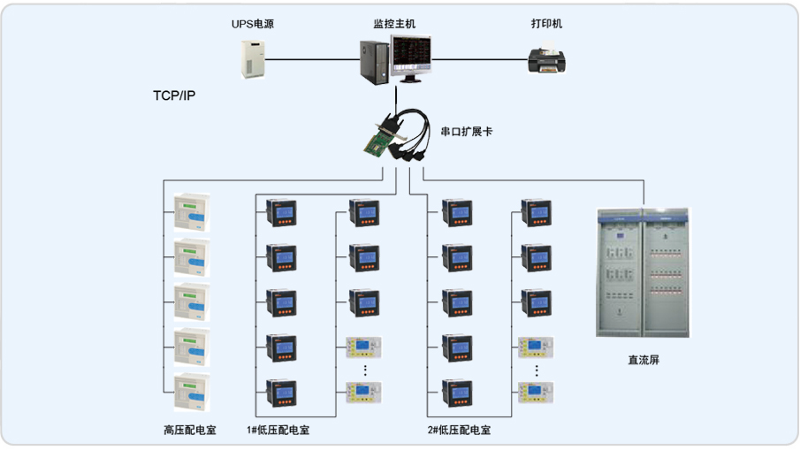 整個系統(tǒng)采用分布式結(jié)構(gòu),高壓配電室、低壓配電室1#、低壓配電室2#內(nèi)現(xiàn)場設(shè)備均采用RS485總線直接接入監(jiān)控主機擴展卡的串口。對于每個回路采用ACR多功能儀表,共126個回路;站控層應(yīng)用國內(nèi)知名的聯(lián)想商用計算機作為監(jiān)控主機,同時設(shè)有用于報表打印輸出的打印機;防止異常斷電而引發(fā)的數(shù)據(jù)丟失的UPS設(shè)備。監(jiān)控軟件平臺采用單機版Acrel-3000型電能管理系統(tǒng)。Acrel-3000型電能管理系統(tǒng)預(yù)留了擴展接口,可方便進行擴展。