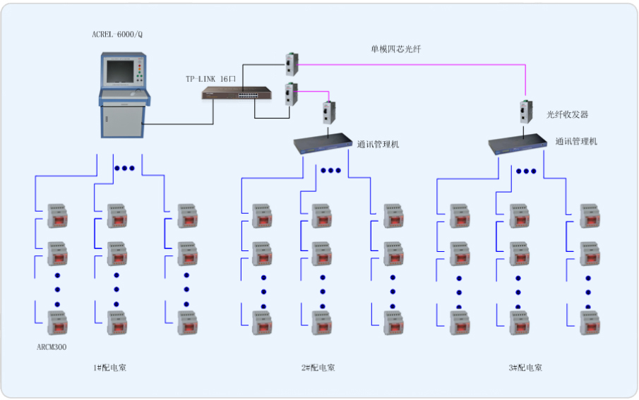 系統(tǒng)組網(wǎng)共分為站控管理層、網(wǎng)絡(luò)通訊層、現(xiàn)場(chǎng)設(shè)備層三層,該項(xiàng)目通訊總線共接入20條通訊總線,總線在樓層配電箱手拉手串接后,接入Acrel-6000/Q電氣火災(zāi)監(jiān)控設(shè)備,組成電氣火災(zāi)系統(tǒng)的大動(dòng)脈。箱體中漏電流互感器通過(guò)電流線接入漏電探測(cè)器,漏電探測(cè)器實(shí)時(shí)顯示漏電情況,組成一套信號(hào)穩(wěn)定,精度可靠的電氣火災(zāi)監(jiān)測(cè)系統(tǒng)?,F(xiàn)場(chǎng)共有449只ARCM系列電氣火災(zāi)探測(cè)器模塊。