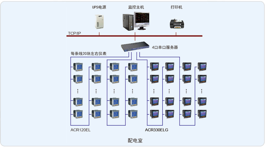 整個系統(tǒng)采用網絡分布式結構,監(jiān)控主機位于地下一層變電所值班室內,配電柜內安裝有本公司ACR330ELH、ACR120EL儀表共計60多回路。仁恒河濱花園電力監(jiān)控系統(tǒng)現(xiàn)場共1個低壓配電室,配電室內采用安科瑞ACR系列電力監(jiān)控儀表采集各回路的電流、電壓、電能等電參量,然后通過中間層采集設備網線到監(jiān)控室計算機上,實現(xiàn)遙測、遙信功能。