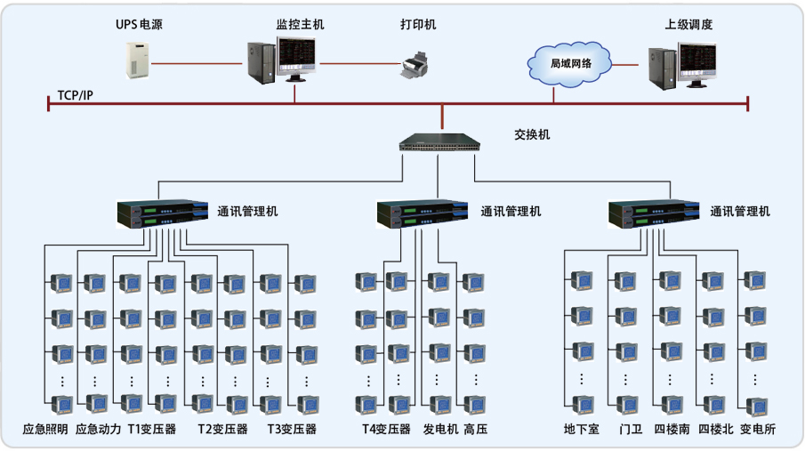 本監(jiān)控系統(tǒng)主要實現(xiàn)對月亮灣集中供冷中心的20/0.4kV配電系統(tǒng)進行監(jiān) 控;監(jiān)控范圍為變電所的T1、T2、T3、T4變壓器進線柜、聯(lián)絡(luò)柜、應(yīng)急照明配電屏1/2、應(yīng)急動力配電屏1/2、高壓柜、變電所的1/2#柴油發(fā)電機配電屏和各樓層所有動力柜??偣?00個回路。