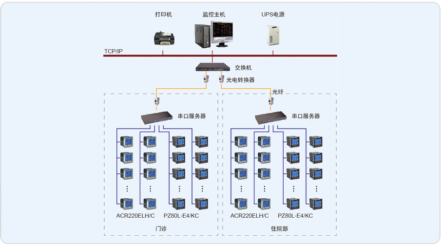 整個系統(tǒng)采用網(wǎng)絡(luò)分布式結(jié)構(gòu),監(jiān)控主機(jī)位于報告廳和外科樓的地下一層的動力中心中。該項(xiàng)目實(shí)現(xiàn)了哈醫(yī)大一院2個樓內(nèi)遠(yuǎn)程精細(xì)化及時性報警。設(shè)計(jì)方案為2個樓內(nèi)的2個配電室,儀表數(shù)據(jù)通過485接口,MODBUS通訊協(xié)議經(jīng)數(shù)據(jù)采集器輸送到值班室主機(jī)。