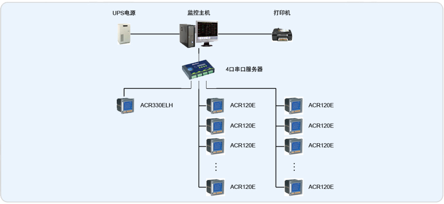 廠區(qū)配電中心為本項(xiàng)目提供一套高、低壓后臺(tái)監(jiān)控系統(tǒng),將對(duì)廠區(qū)內(nèi)電氣室中改造安裝的19塊智能電測(cè)儀表進(jìn)行集中監(jiān)視。具體監(jiān)控?cái)?shù)據(jù)為:用電量計(jì)量、實(shí)時(shí)測(cè)量相電壓、線電壓、有功功率、無(wú)功功率、視在功率、功率因數(shù)、頻率等數(shù)據(jù),能打印月度用電報(bào)表,并有歷史曲線的查詢(xún)(時(shí)間不小于30天),重要回路需要對(duì)其諧波進(jìn)行測(cè)量。各參數(shù)及數(shù)據(jù)通過(guò)RS485總線,通過(guò)網(wǎng)絡(luò)送至配電中心的電工值班室(后臺(tái)監(jiān)控中心)。