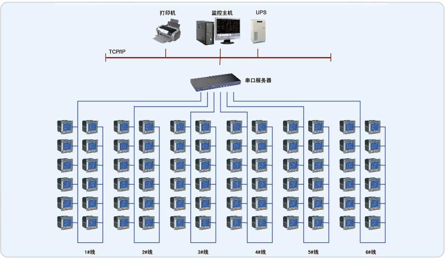 博歐木特種紙業(yè)有限公司三期電力監(jiān)控系統(tǒng)針對(duì)淄博歐木特種紙業(yè)有限公司內(nèi)三期低壓配電室開關(guān)柜內(nèi)安裝的安科瑞智能電力儀表,現(xiàn)場(chǎng)約120只儀表,監(jiān)控室位于配電室內(nèi)。為滿足配電室統(tǒng)一監(jiān)控的要求,配電室現(xiàn)場(chǎng)安裝安科瑞公司網(wǎng)絡(luò)電力儀表通過(guò)屏蔽雙絞線手拉手相連至串口服務(wù)器,串口服務(wù)器通過(guò)五類線接入后臺(tái)主機(jī),進(jìn)行數(shù)據(jù)傳輸。