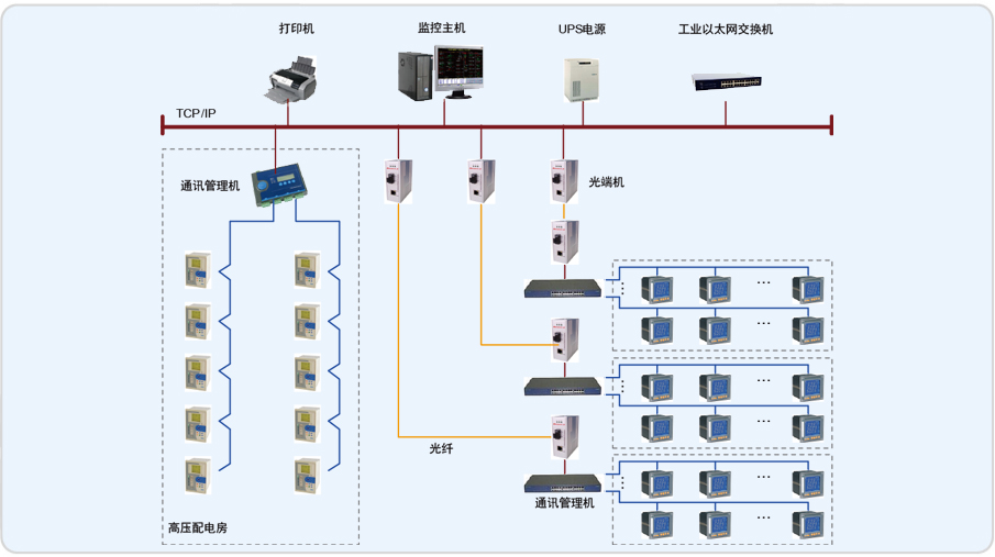 系統(tǒng)采用分層分布式結(jié)構(gòu),在高壓配電房設(shè)置一臺(tái)4口的通訊管理機(jī),采用RS485總線將網(wǎng)絡(luò)儀表接入通訊管理機(jī),直接與交換機(jī)相連,進(jìn)行數(shù)據(jù)上傳;在每個(gè)低壓配電室設(shè)置一臺(tái)16口通訊管理機(jī),采用RS485總線將網(wǎng)絡(luò)儀表接入通訊管理機(jī),再通過光纖傳輸,將采集的所有現(xiàn)場(chǎng)設(shè)備的數(shù)據(jù)傳至監(jiān)控主機(jī),實(shí)現(xiàn)遠(yuǎn)程電參量實(shí)時(shí)監(jiān)測(cè)。