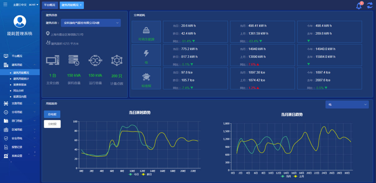對建筑、部門、區(qū)域、支路、分類分項等用能進行對比,支持當日逐時趨勢、當月逐日趨勢曲線、分時段能耗統(tǒng)計對比、總能耗 同環(huán)比對比。