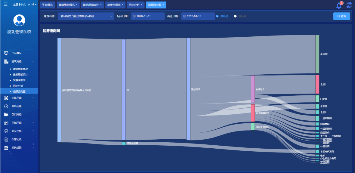 能源流向圖展示單棟建筑指定時段內(nèi)各類能源從源頭到末端的的能源流向,支持按原始值和折標值查看。