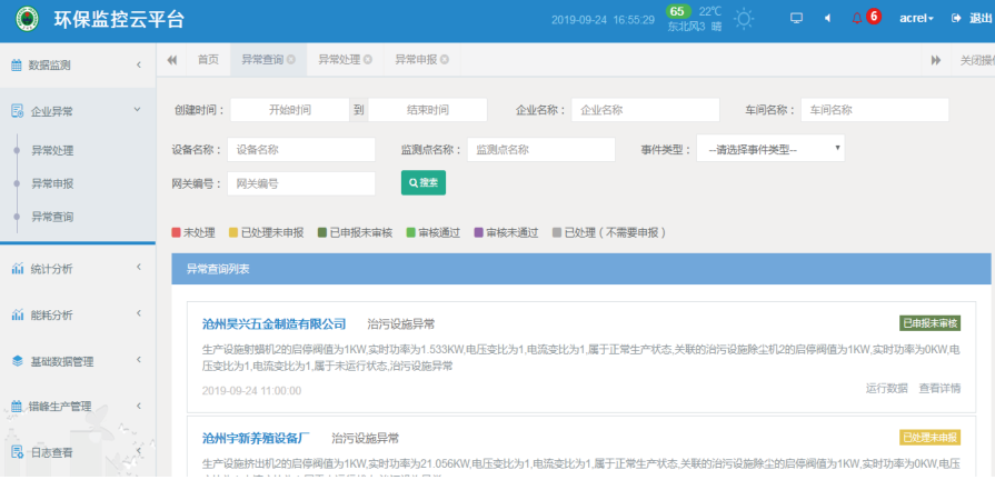 企業(yè)運行狀態(tài)統(tǒng)計:按年/月/日統(tǒng)計分析企業(yè)、監(jiān)測點、產(chǎn)污設施、治污設施等異常產(chǎn)生的情況。