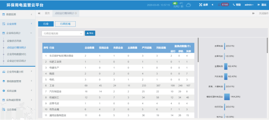 點位運行情況分析:按行業(yè)或區(qū)域統(tǒng)計分析企業(yè)、監(jiān)測點、產(chǎn)污設施、治污設施等數(shù)量及運行狀態(tài)。
