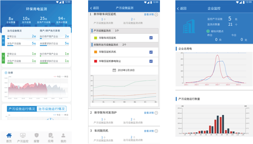 平臺首頁顯示企業(yè)概況,用電統(tǒng)計,產(chǎn)污設施運行柱狀圖,治污設施運行柱狀圖,如圖所示: