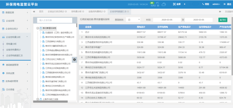 企業(yè)用電數(shù)據(jù)分析:按年/月/日統(tǒng)計企業(yè)以及行政區(qū)域的總用電情況,可導出成報表。