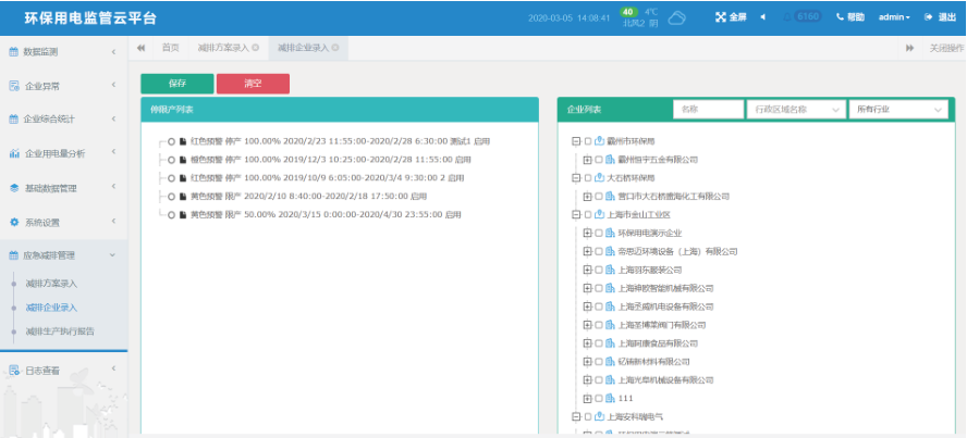 減排企業(yè)錄入:按企業(yè)/行業(yè)/區(qū)域批量配置企業(yè)需要執(zhí)行的減排方案。