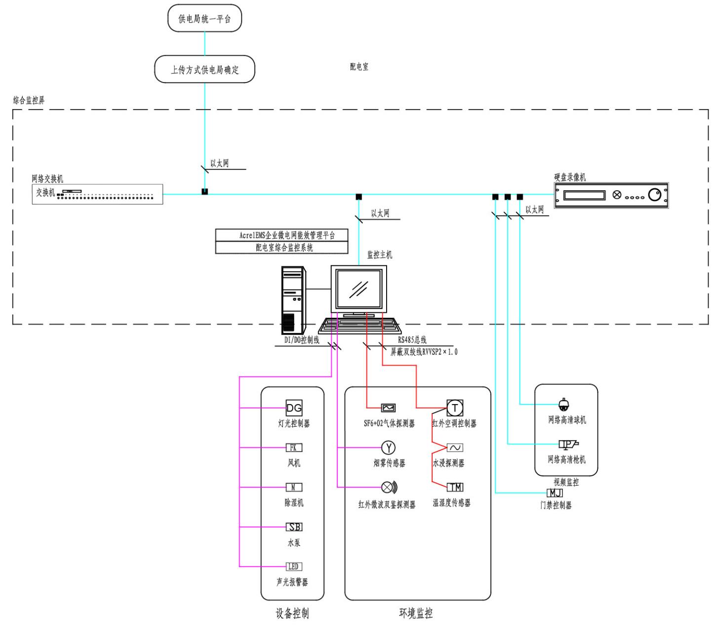 配電室綜合監(jiān)控系統(tǒng)包括智能監(jiān)控系統(tǒng)屏、通訊管理機(jī)、UPS電源、視頻監(jiān)控子系統(tǒng)(云臺(tái)球機(jī)、槍機(jī))、環(huán)境監(jiān)測(cè)子系統(tǒng)(溫度、濕度、水浸、煙感)、控制子系統(tǒng)(燈光、空調(diào)、除濕機(jī)、風(fēng)機(jī)、水泵)、門(mén)禁監(jiān)控子系統(tǒng)(讀卡器、開(kāi)門(mén)按鈕、磁力鎖)、安防監(jiān)控子系統(tǒng)(雙鑒檢測(cè)器)。