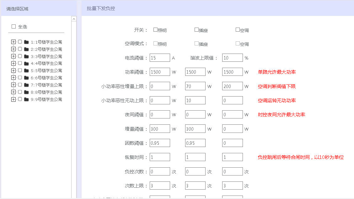 限制學(xué)生使用違章電器,當(dāng)接入未經(jīng)允許的違章電器時(shí),支路跳閘。空調(diào)模式:空調(diào)模式下,電表持續(xù)檢測(cè)空調(diào)微弱待機(jī)電流,一但存在拔斷空調(diào)插座的動(dòng)作,電表便跳閘,且只能通過聯(lián)系管理人員進(jìn)行合閘送電。允許除空調(diào)模式以外的跳閘動(dòng)作自動(dòng)合閘。允許次數(shù),跳閘等待時(shí)間可設(shè)置,支持批量設(shè)置。