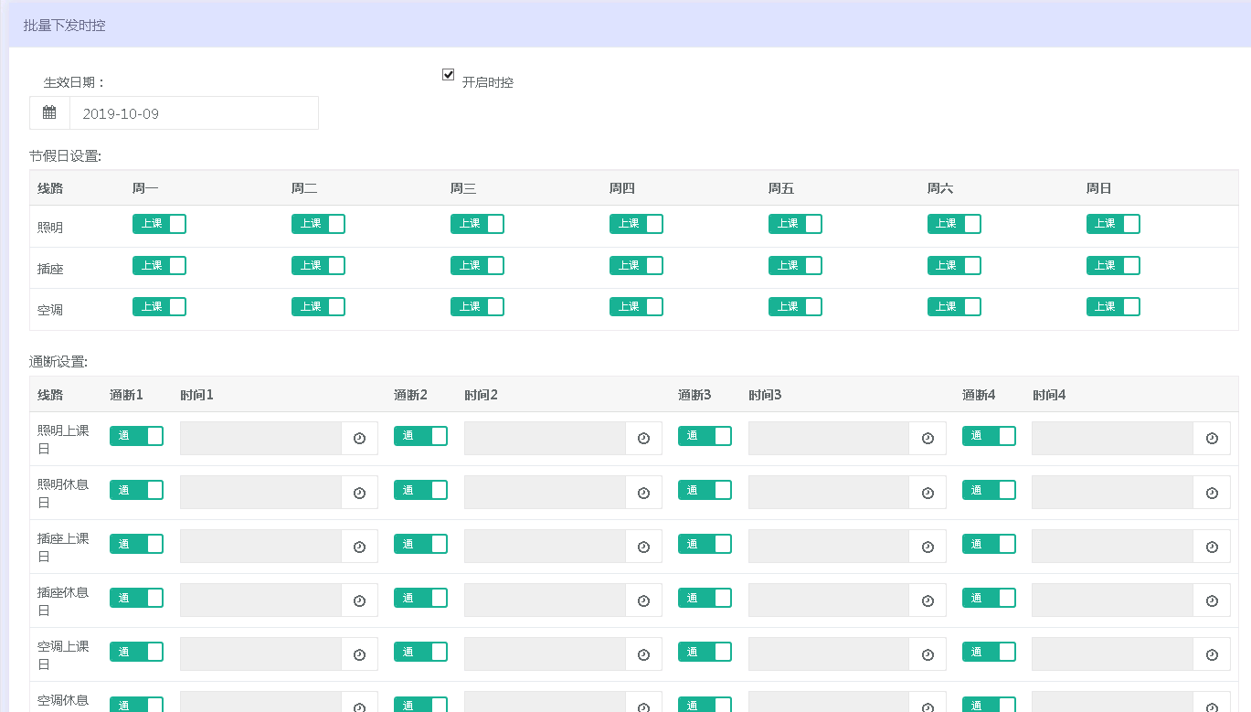 為方便學(xué)校管理學(xué)生作息,系統(tǒng)可以設(shè)置多個(gè)時(shí)間段,定時(shí)控制宿舍斷電送電時(shí)間。每個(gè)回路可單獨(dú)設(shè)置,可以區(qū)分上課日和雙休日,支持8個(gè)時(shí)段,參數(shù)下發(fā)至電表,由電表獨(dú)立控制回路通斷,不受通訊問題影響。