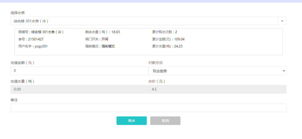 系統(tǒng)同樣支持水表的預(yù)付費(fèi)功能,通過選購(gòu)我司合作品牌積成、巨靈、青島浪濤等水表,不僅支持普通188和ModBus協(xié)議的水表,也支持NB水表。