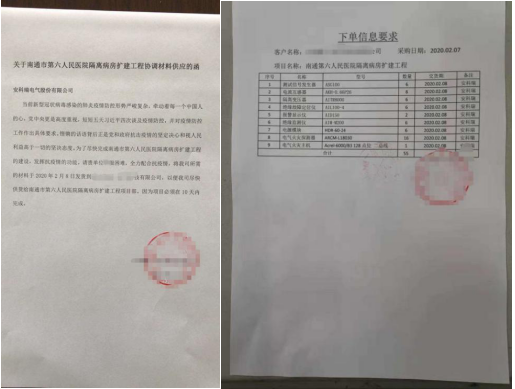 2月7日,安科瑞接到南通市第六人民醫(yī)院隔離病房擴(kuò)建工程協(xié)調(diào)材料供應(yīng)函,要求在2月8日下午貨到南通。