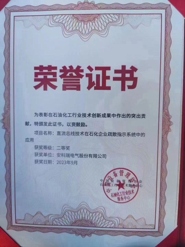 安科瑞受邀參會,安科瑞直流總線技術(shù)在石化企業(yè)疏散指示系統(tǒng)中的應(yīng)用項(xiàng)目榮獲石油化工行業(yè)技術(shù)創(chuàng)新成果二等獎。