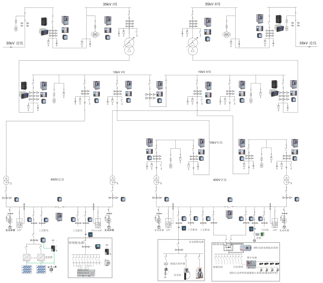 電力監(jiān)控系統(tǒng)主要針對(duì)水務(wù)廠區(qū)變電站、開閉所和10/0.4kV配電房,對(duì)電源進(jìn)線配置電能質(zhì)量監(jiān)測(cè)裝置實(shí)時(shí)監(jiān)測(cè)進(jìn)線電能質(zhì)量,包括電壓閃變、跌落、電壓合格率等數(shù)據(jù)生成電能質(zhì)量分析報(bào)告。高壓回路配置微機(jī)保護(hù)裝置進(jìn)行保護(hù)和監(jiān)控,對(duì)配電房0.4kV出線配置多功能計(jì)量?jī)x表,用于測(cè)控出線回路電氣參數(shù)和用能情況。同時(shí)對(duì)變電站(所)內(nèi)重要設(shè)備如柴油發(fā)電機(jī)、無功補(bǔ)償裝置、有源濾波裝置、狀態(tài)進(jìn)行監(jiān)測(cè)。