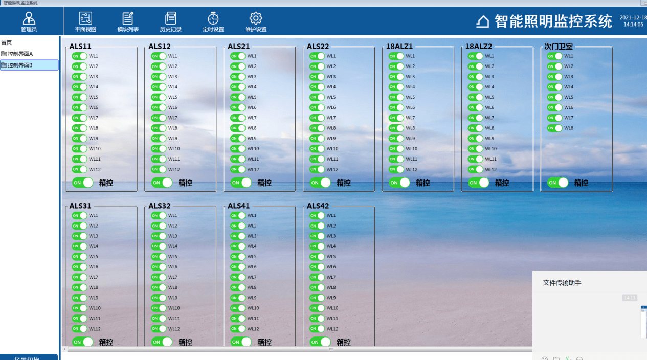 可以通過電腦或者觸控終端控制一棟樓、某一層或某個區(qū)域所有照明燈具開關(guān)??梢詫蝹€照明回路實現(xiàn)開關(guān)控制,還可對每個模塊、箱子、樓層、自定義分區(qū)實現(xiàn)總控?,F(xiàn)場受控回路的開關(guān)狀態(tài)會實時反饋。