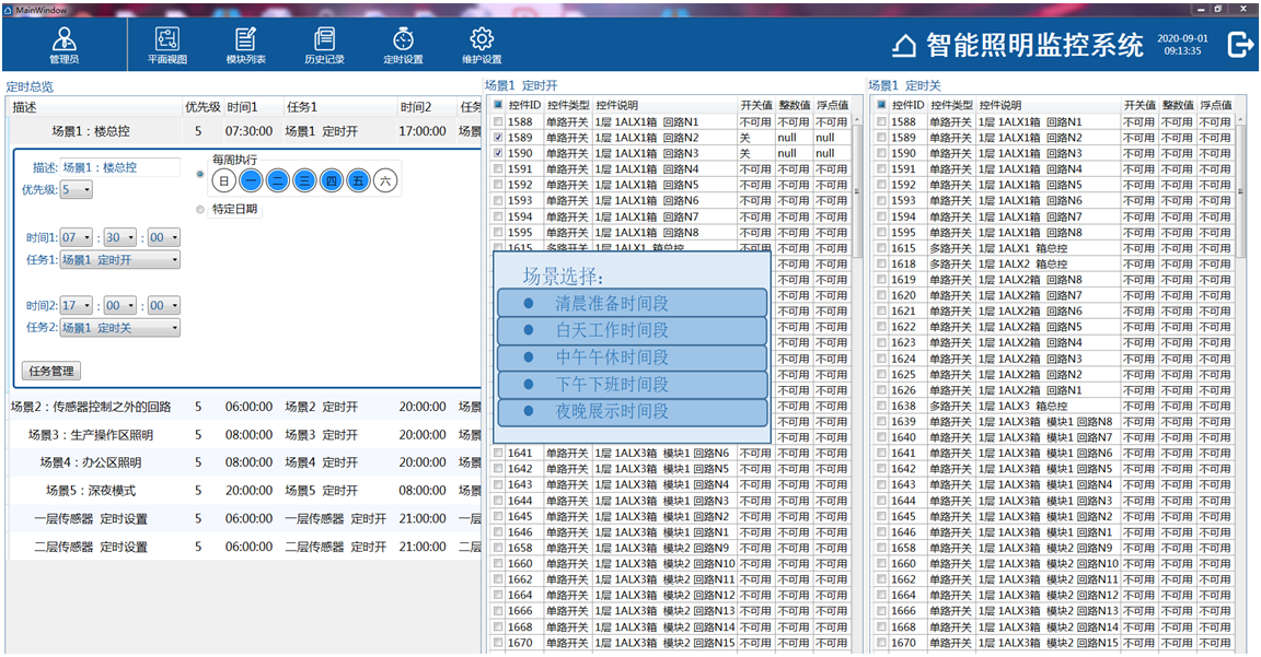智能照明控制系統(tǒng)根據(jù)不同區(qū)域的功能需求,設(shè)定不同的場景模式,完成各種照明燈具的控制組合,達(dá)到美化工作環(huán)境、提高舒適度。