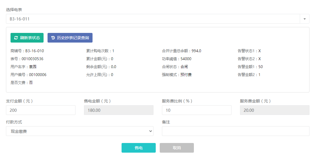 可以對已開戶的電表進(jìn)行遠(yuǎn)程售電,電費(fèi)實(shí)時下發(fā)到電表,電表會根據(jù)電度走字實(shí)時扣除電費(fèi)。售電可以設(shè)置服務(wù)費(fèi)比例,實(shí)際充值到表中的金額將按比例扣除服務(wù)費(fèi)之后再下發(fā),作為物業(yè)增加收取服務(wù)費(fèi)的渠道。