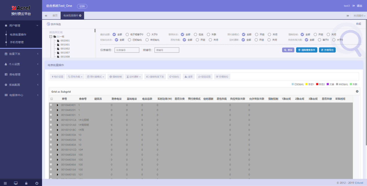 該功能提供電能表批量通斷電、設(shè)置下發(fā)、狀態(tài)篩選、下發(fā)和查詢操作??蓪?duì)指定的某戶或多戶同時(shí)進(jìn)行“電價(jià)設(shè)置”、“惡性負(fù)載”、“預(yù)付費(fèi)模式”、“強(qiáng)制控制”、“定時(shí)通斷”、“基礎(chǔ)電量下發(fā)”、“初始化”、“清零”、“短信設(shè)置”、“空調(diào)復(fù)位”等操作。