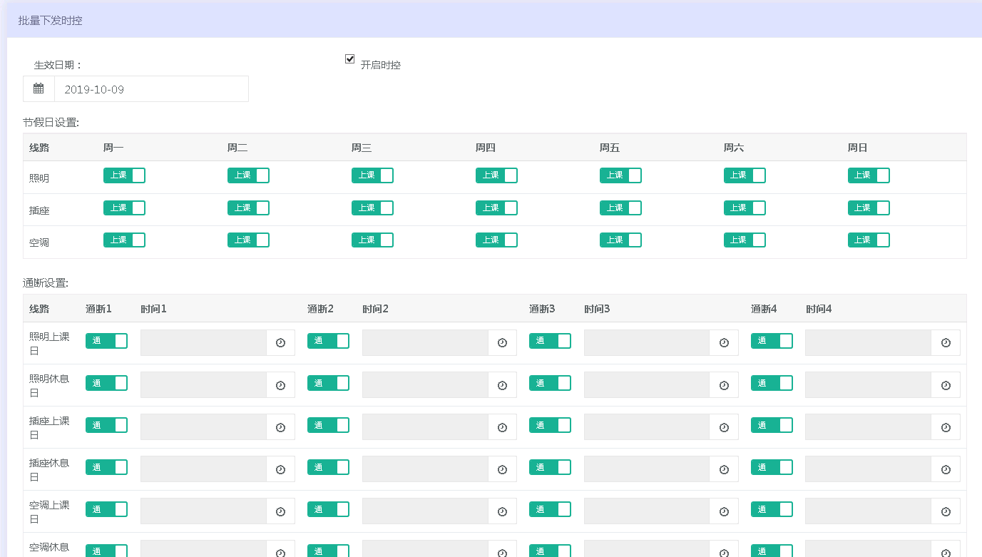 設(shè)置工作日和節(jié)假日宿舍每天用電通斷時(shí)間,最多支持八個(gè)時(shí)間段,三路可以單獨(dú)設(shè)置。