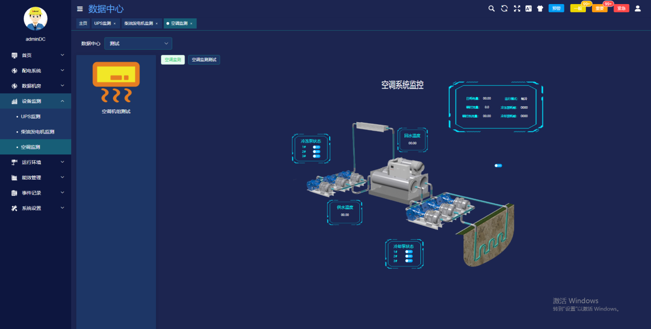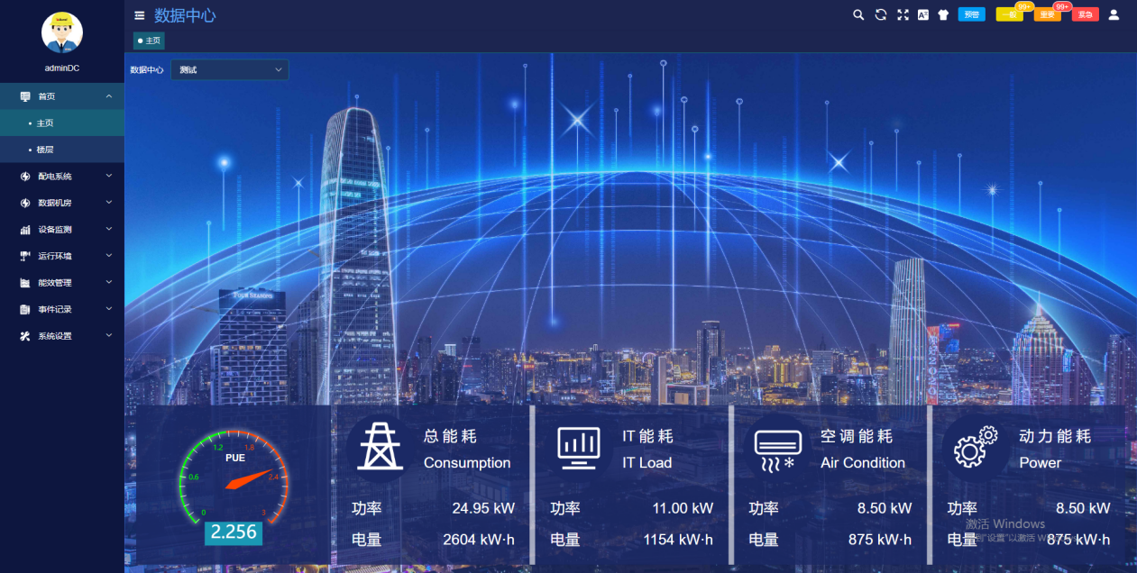 默認(rèn)打開系統(tǒng)的“主頁”界面。顯示該數(shù)據(jù)中心的實(shí)時PUE值,總能耗,IT能耗,空調(diào)能耗,動力能耗。