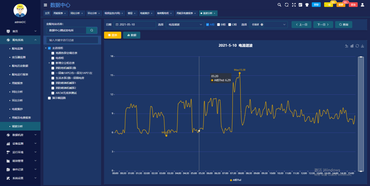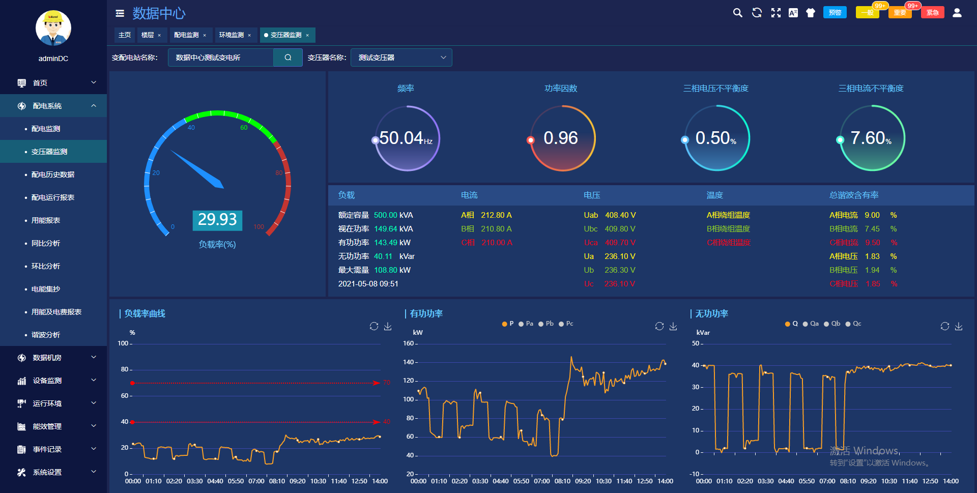 變壓器監(jiān)測監(jiān)測頁面實(shí)時監(jiān)測各變壓器各項參數(shù),包括福賊率。頻率,功率因數(shù),三相不平衡度等,并且顯示歷時曲線圖,數(shù)據(jù)實(shí)時變化。幫助用戶直觀監(jiān)測各變壓器運(yùn)行狀態(tài)。
