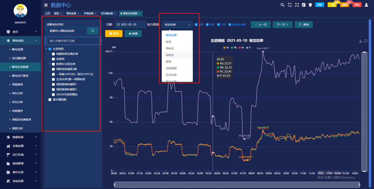 配電歷史數(shù)據(jù)可以展示每個配電回路的電流,電壓,功率因數(shù)等參數(shù)。并且可以通過日期,查詢歷史數(shù)據(jù)。