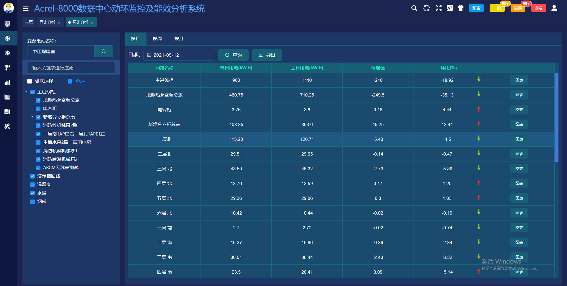 顯示各個用電回路。每日、每周、每月的環(huán)比用能情況。顯示增長或者下降比例。