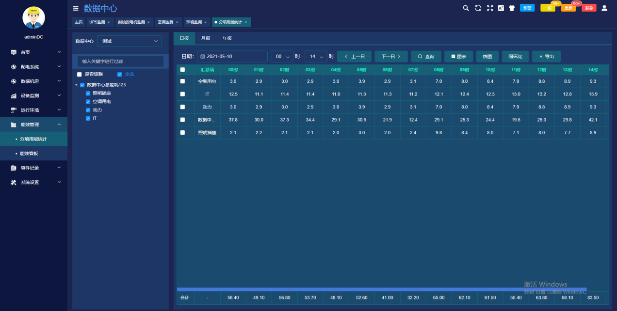 顯示當(dāng)前數(shù)據(jù)中心,IT、空調(diào)、照明動力用電各時段的用電情況。