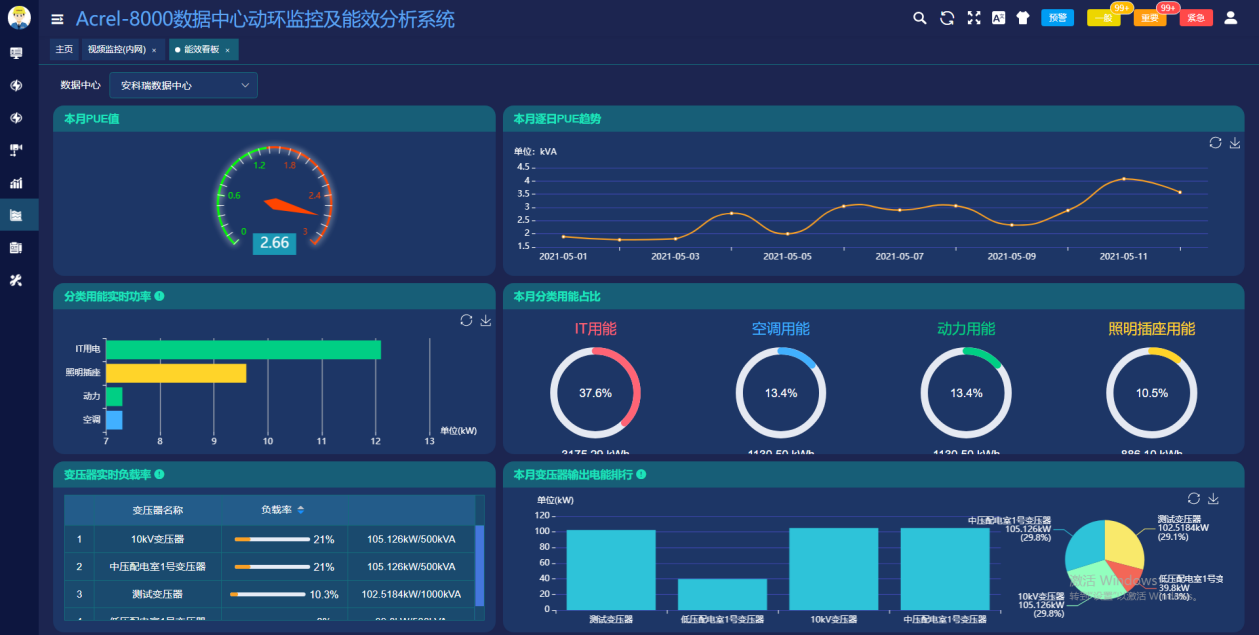 能效看板實(shí)時顯示當(dāng)前數(shù)據(jù)中心PUE值以及歷史PUE曲線。并且顯示各分項用能的用能情況及用能排行。監(jiān)測各變壓器運(yùn)行及負(fù)載情況,給出本月變壓器輸出電能排行。