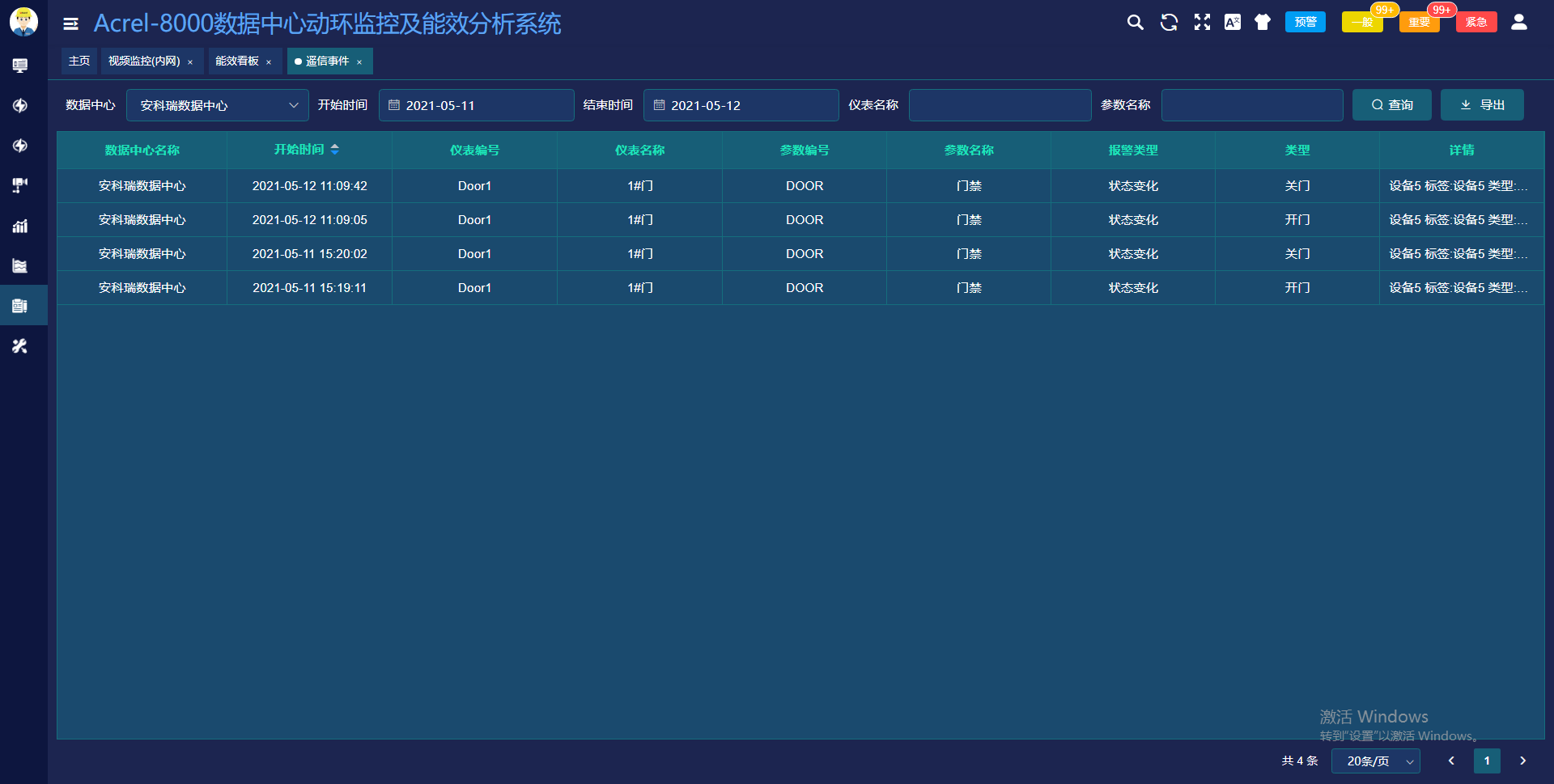 顯示當(dāng)前數(shù)據(jù)中心各遙測量、如門禁、煙霧、水浸等狀態(tài)變化的報警情況。