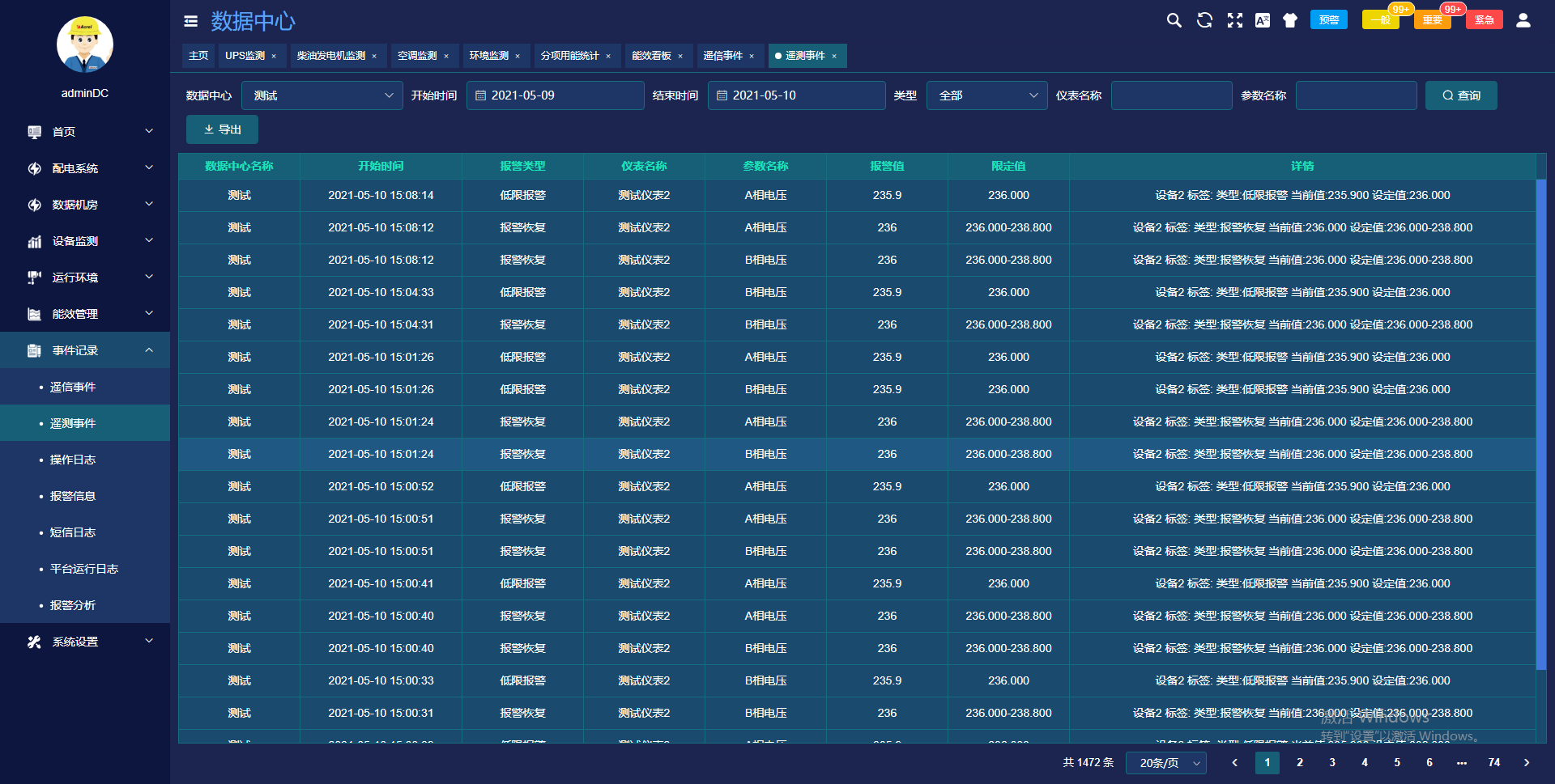 顯示當(dāng)前數(shù)據(jù)中心各遙測量、如電流、電壓、功率等電參量越線的報警情況。