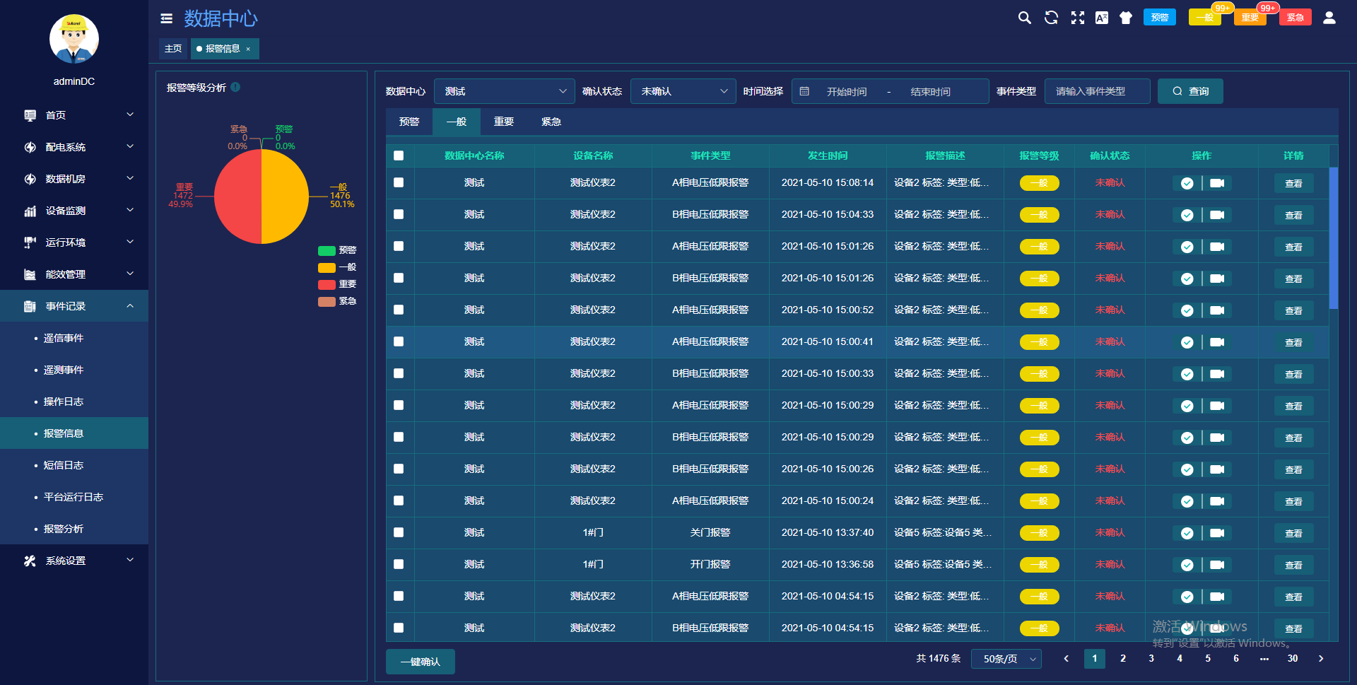 顯示當(dāng)前數(shù)據(jù)中心下各報警的確認(rèn)狀態(tài),幫助用戶確認(rèn)當(dāng)前數(shù)據(jù)中心的運(yùn)行狀態(tài)。提醒用戶有哪些存在的安全隱患。