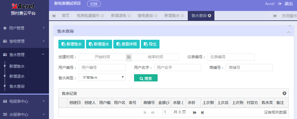 系統(tǒng)提供了新增售水、充正、退電,明細及分類查詢。