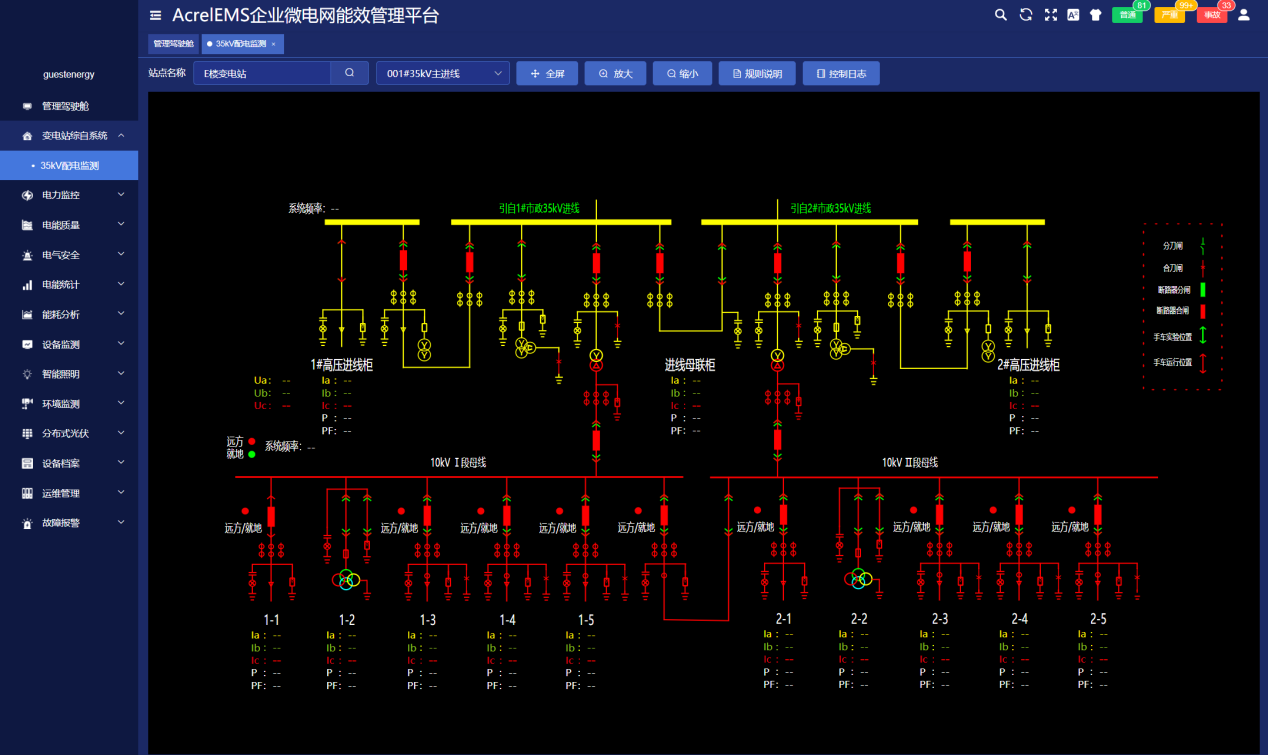 系統人機界面友好,以配電一次圖的形式直觀顯示配電線路的運行狀態(tài),實時監(jiān)測各回路電壓、電流、功率、功率因數、電能等電參數信息,動態(tài)監(jiān)視各配電回路斷路器、隔離開關、地刀等合分狀態(tài)、柴油發(fā)電機狀態(tài)、柴油液位、UPS狀態(tài)、電池信息等,以及有關故障、告警等信號。