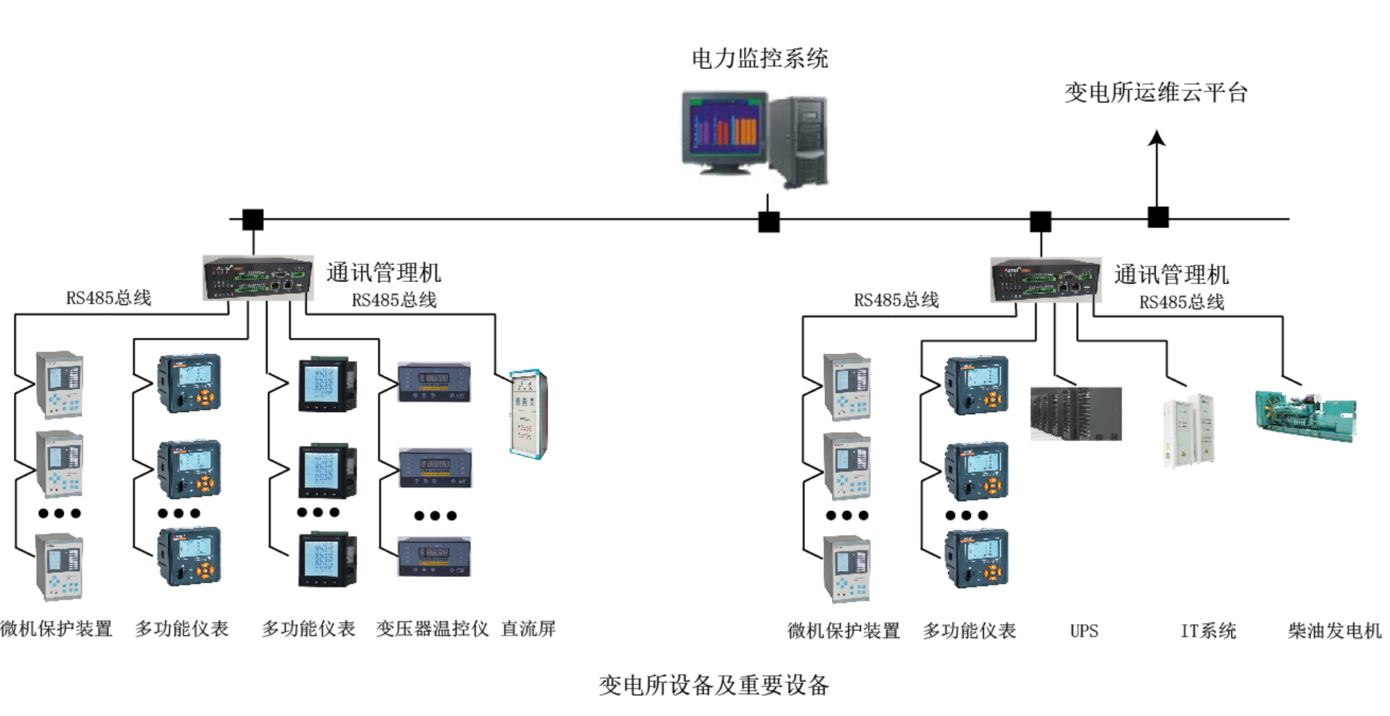 系統(tǒng)采用分布式結(jié)構(gòu),微機保護裝置、多功能儀表、變壓器溫控器、直流屏、柴油發(fā)電機控制屏等設(shè)備通過RS485總線或者以太網(wǎng)接入智能網(wǎng)關(guān),經(jīng)過協(xié)議轉(zhuǎn)換、數(shù)據(jù)處理后上傳至電力監(jiān)控系統(tǒng),實現(xiàn)遙測、遙信、遙控、異常報警等功能。